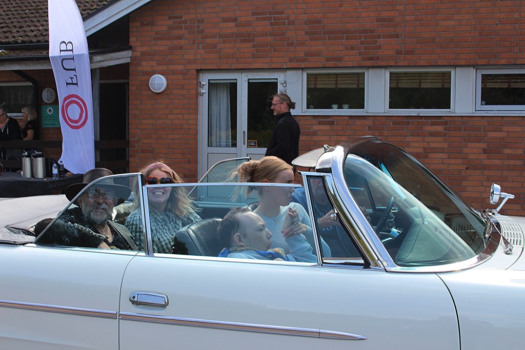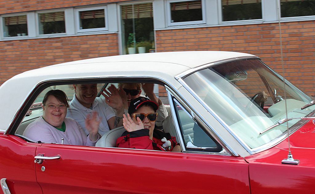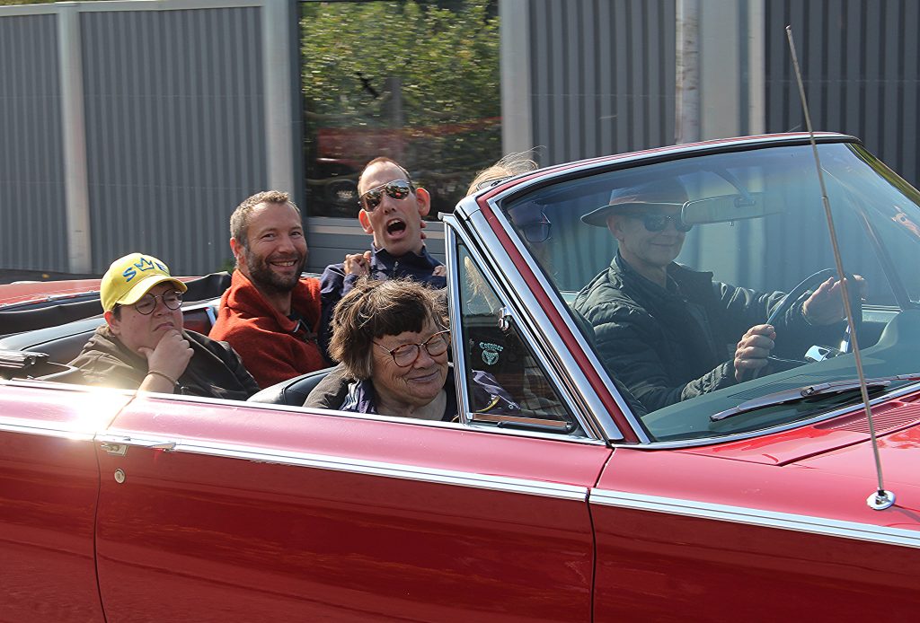 I en röd Chrysler har Björn, Sofie och Anita tagit plats med sina assistenter. Det är tur att det finns starka assistenter som orkar lyfta. Imponerande.