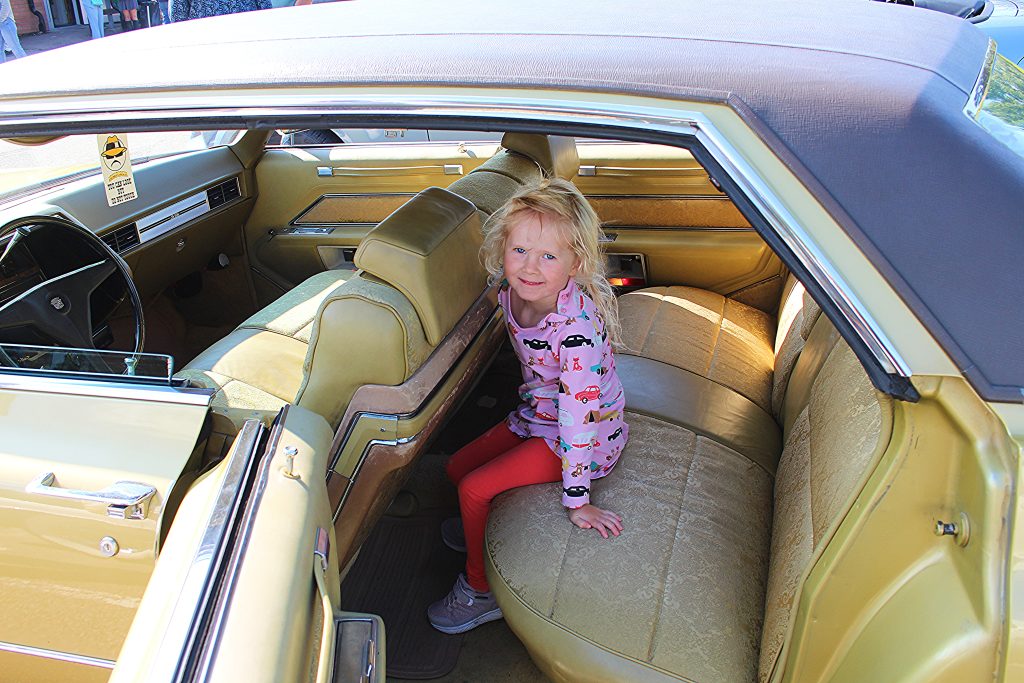 Ester passade på att provsitta i några bilar. Men den finaste var nog denna Cadillac i guld och med en jättefin guldklädsel inuti. Ester passar ju väldigt fint in i bilen.