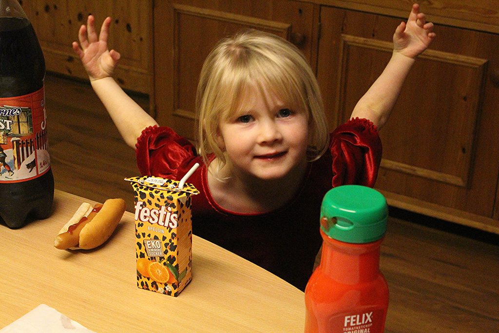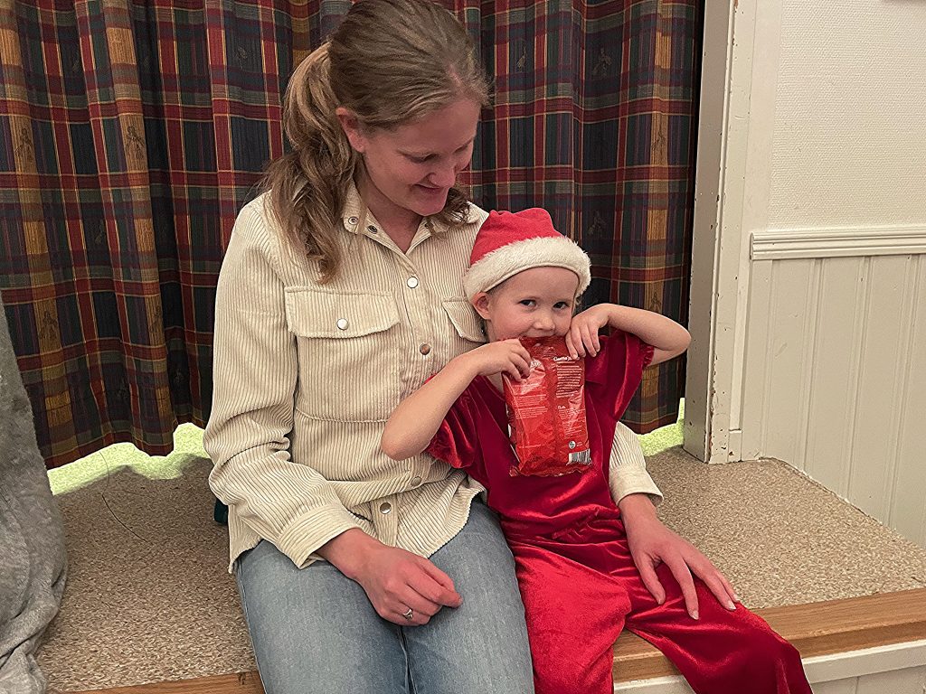 Jens i en fin jultröja väntar på korv med bröd och Lovisa och Petter testar sina vinster på golvet.