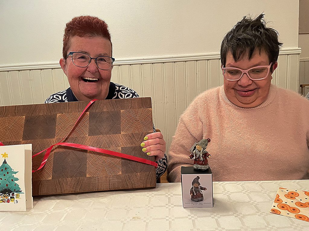 Två av dagens vinnare var Susanne och Eva. Susanne var den som tog hem storvinsten. Skärbrädan som Lars gjort. Inte undra på att Susanne är glad.