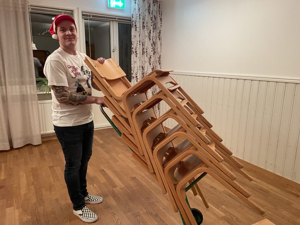 Aktivitetskommittén träffas på förmiddagen och sätter upp bord och stolar. Petter hjälper till att köra fram stolar.