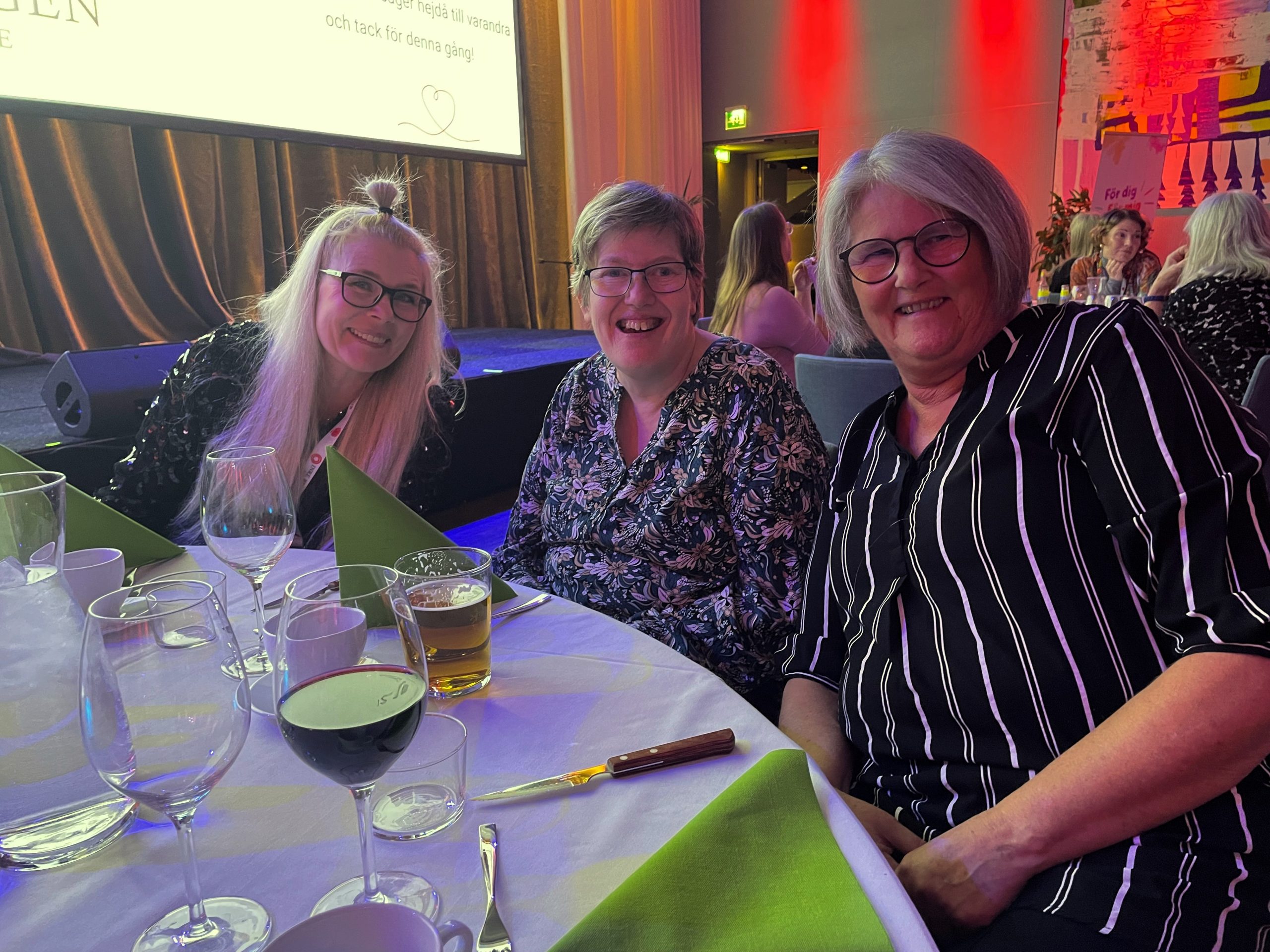 Pia från kansliet, Gunilla och Inger ser fram emot god mat och kvällens underhållning.