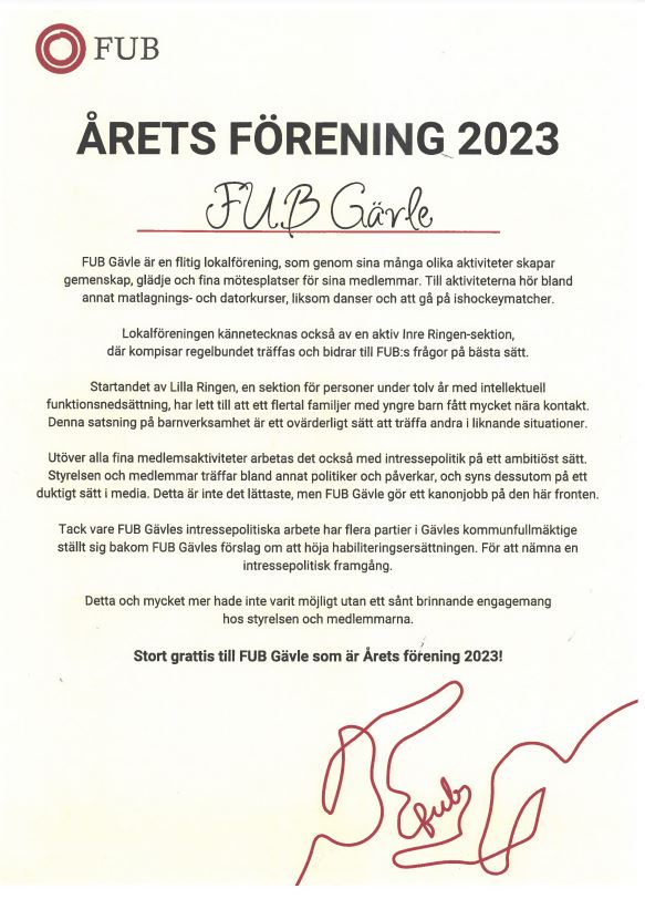 Vi blev idag glädjande nog uppvaktade av FUB Sverige och Inre Ringen Sverige som meddelade att vi blivit årets FUB-förening 2023 !!