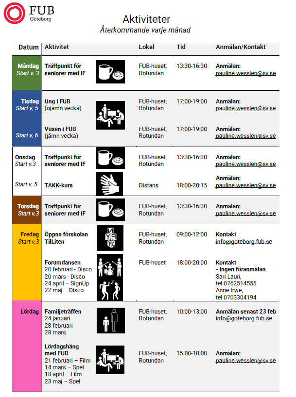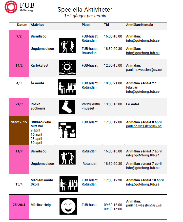 Här är aktiviteter som bara händer en eller två gånger per termin.