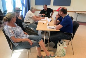 Alla presenterade sig för varandra. Deltagarna kom från Kungsbacka, Halmstad, Hyltebruk, Knäred och Laholm. Alla fick skriva sina namn på skyltar så alla vet vad man heter.