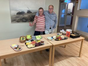 Här är det Johan och Andreas som bjuder de andra att ta för sig av alla goda ostar.