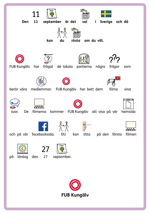 Vi från FUB Kungälv hoppas att alla partierna skickar in filmer som visar vad partierna tycker, innan vi ska rösta den 11 september.