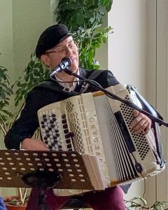 Vi äter våfflor, dricker kaffe eller saft och Emil sjunger och spelar