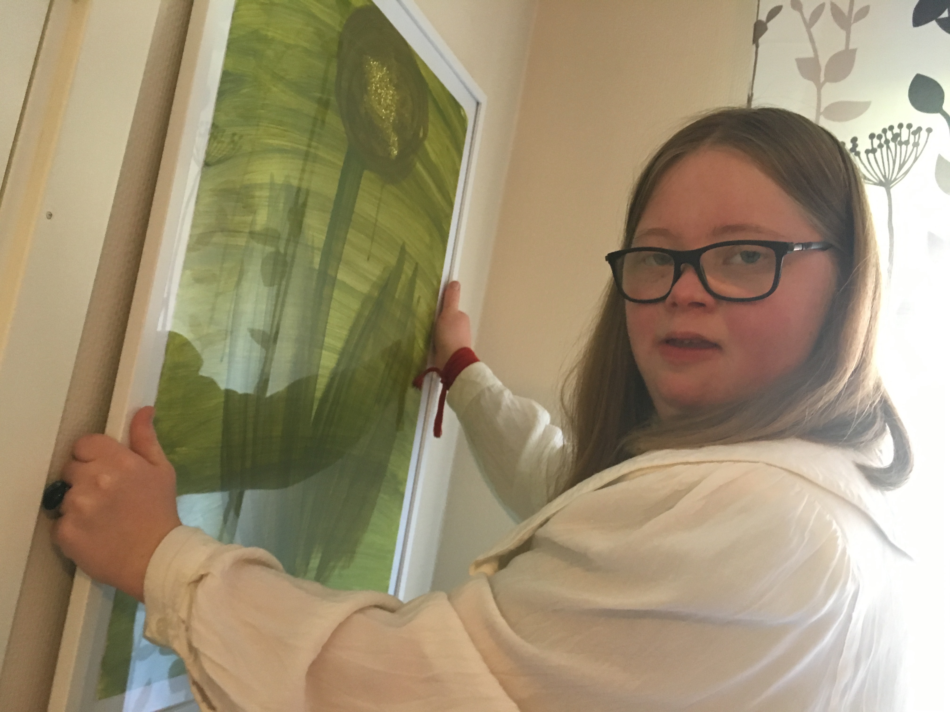 Årets Inre Ringen-aktivist 2019 Klara provar att hänga upp tavlan på väggen.