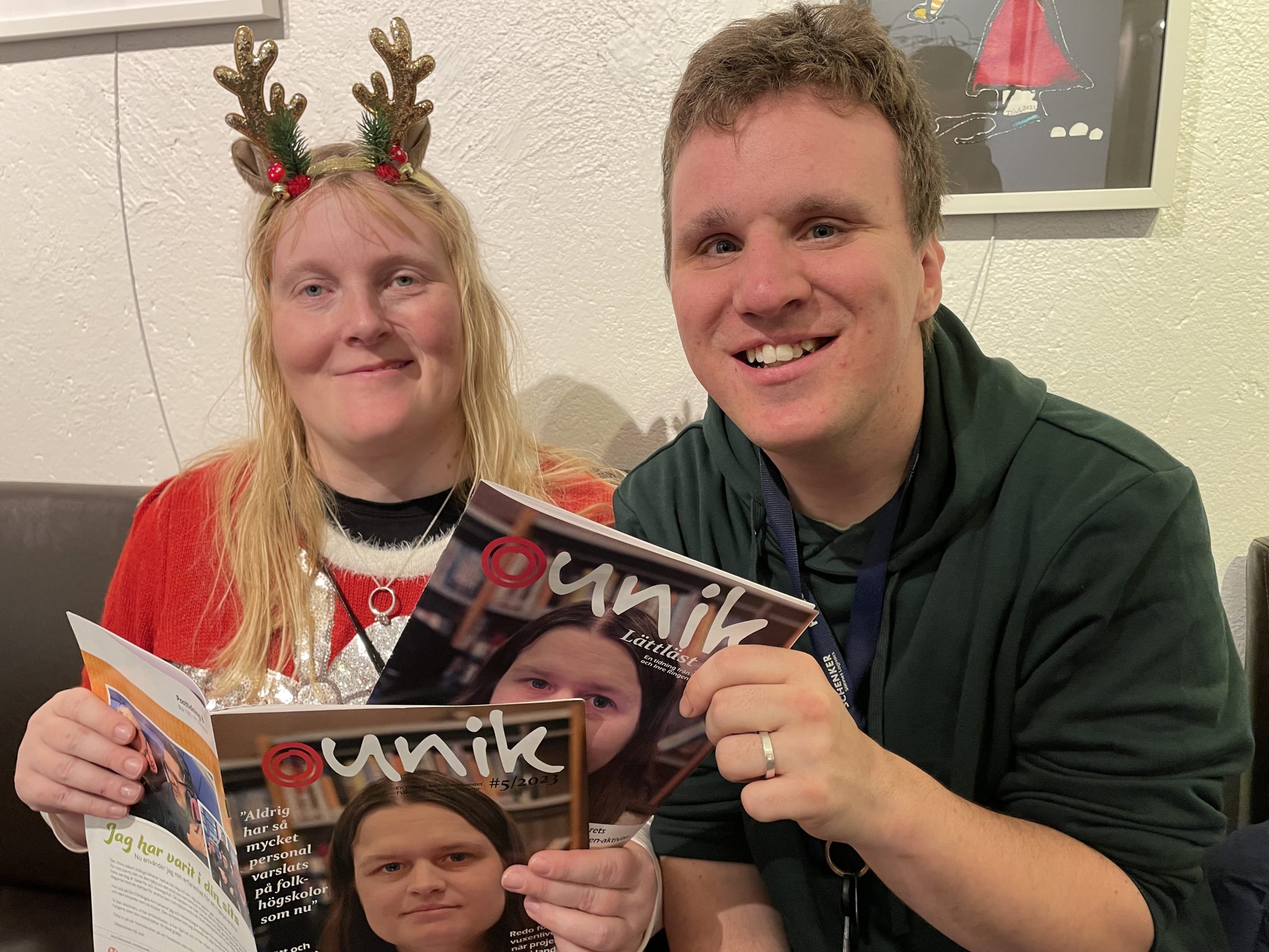 På bilderna är det några medlemmar på FUB Huddinges julfest som kikar i senaste numret av Unik.
